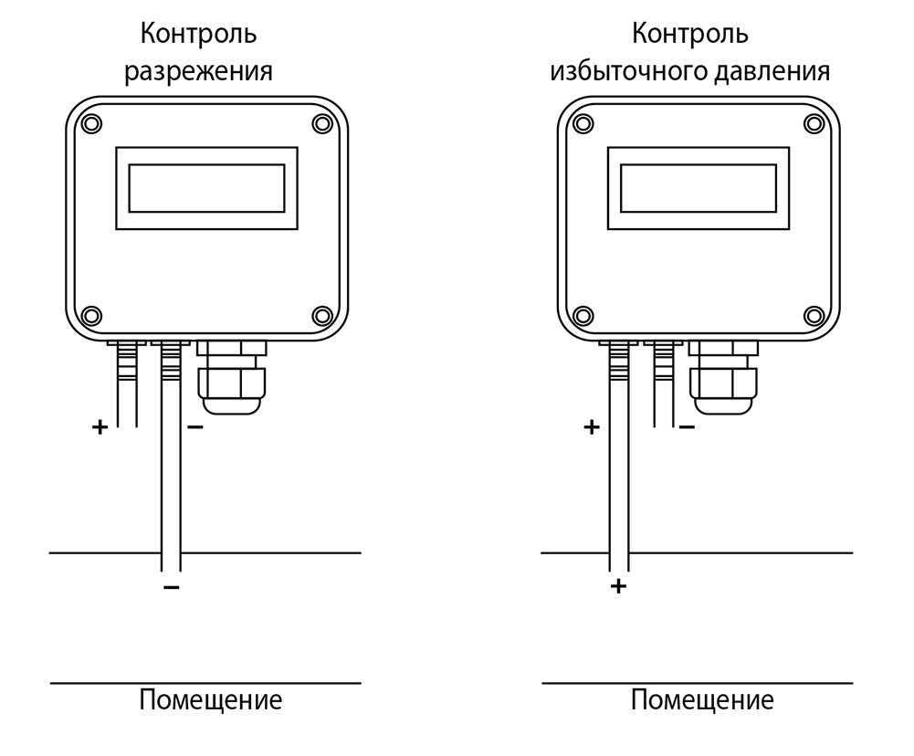 Тип измеряемого давления зависит от места подвода трубок «+» и «–». Трубка «+» подводится в точку где давление предполагается большим, а трубка «–» - меньшим.