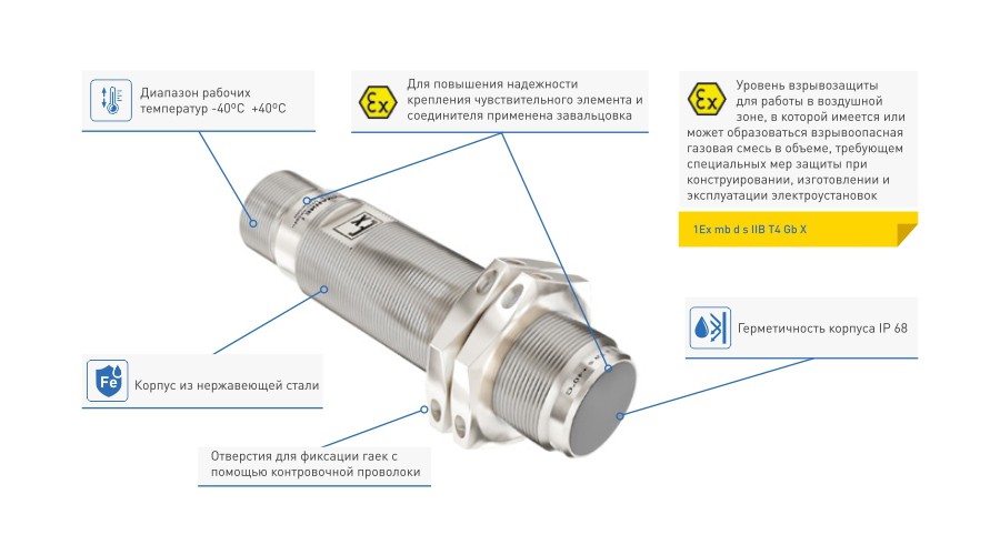 Индуктивный датчик ВТИЮ.1545.82 является бесконтактным выключателем и может применяться во взрывоопасных зонах помещений и наружных установок в соответствии с присвоенной маркировкой взрывозащиты 1Ex mb d s IIB T4 Gb X, требованиями ГОСТ IEC 60079-1-2011 и отраслевых Правил безопасности, регламентирующих применение данного оборудования во взрывоопасных зонах.